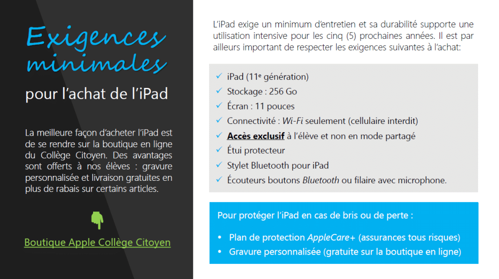 Ton iPad te servira à plusieurs choses en classe, comme à la maison. Ce sera à la fois ton agenda, ton calepin de notes, ton aide-mémoire, ton album-photos, ton carnet de croquis, ton cahier d’exercices, ton livre de lecture, ton dictionnaire, ton outil de communications, ton tableau de bord, ton moteur de recherche et plus encore. C’est aussi un moyen de te changer les idées en écoutant de la musique ou en jouant au dernier jeu de l’heure, mais ton iPad est avant tout un outil pédagogique en soutien à tes apprentissages.
